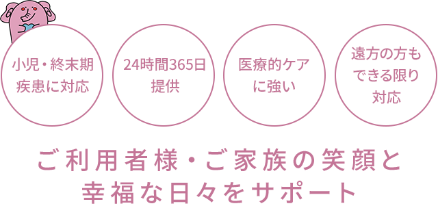 がん、神経難病、認知症、独居の方、高齢者世帯、小児難病、小児癌、精神障害など、どんな疾患にも対応しており、スタッフは、経験豊富なメンバーが多く、専門スキルで手厚いケアを行います。とにかく温かいケアを重視し、ご利用者様やご家族様との信頼関係を大切にしています。